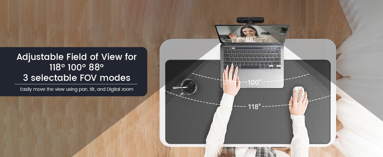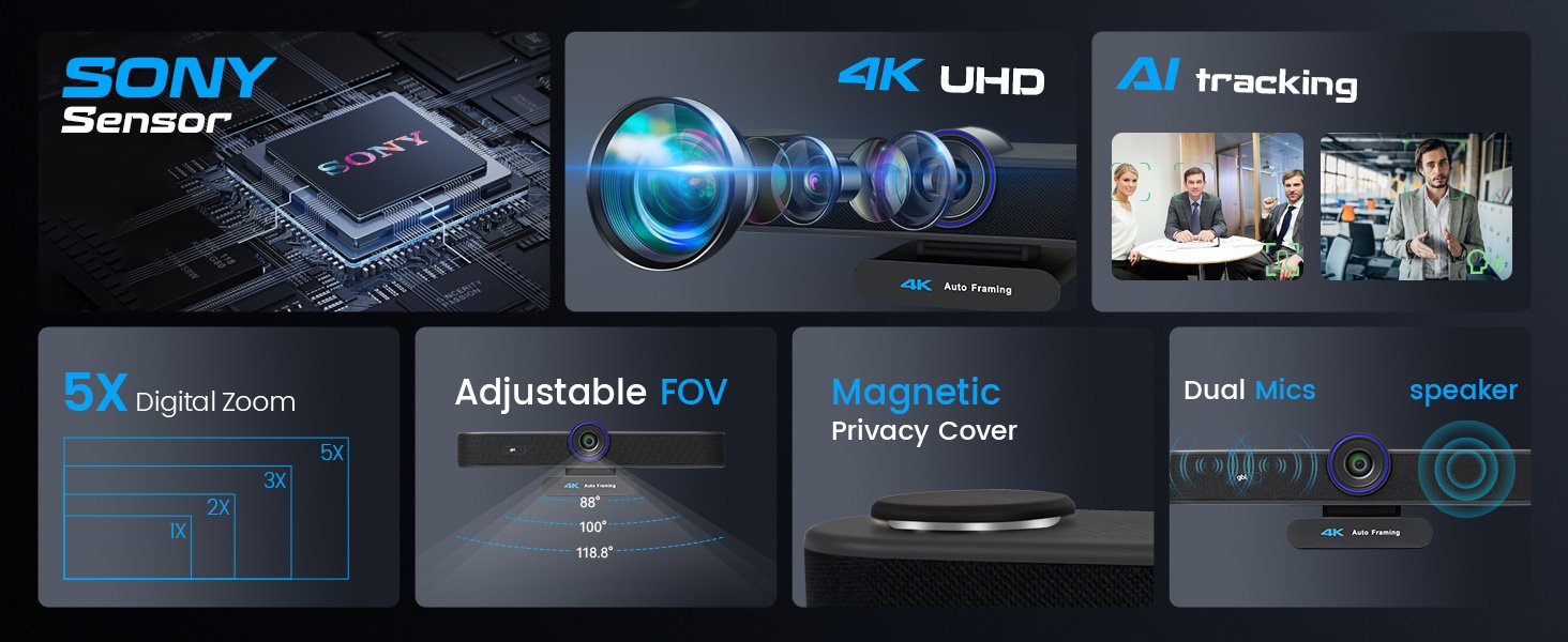 A 4K ePTZ camera, 4 electret microphones, and high-performance speaker in one compact device, delivering exceptional audiovisual quality too small to medium sized spaces. Featuring a 1/2.8″4K UHD CMOS sensor with 8.29 megapixels, it captures ultra sharp 4K video at 30fps and ensures lifelike clarity for meetings and video calls.